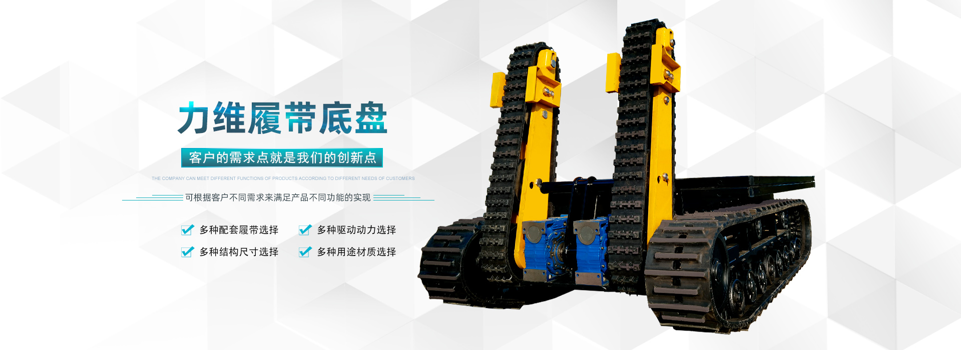 公司秉承“因為專注,所以超越”的商業(yè)理念,“科技創(chuàng)造美好未來”的企業(yè)發(fā)展信念,以不斷進取、勇于創(chuàng)新的企業(yè)精神,不斷拓展與完善產(chǎn)業(yè)鏈,客戶的需求點就是我們的創(chuàng)新點。力維智能裝備,您身邊的履帶裝備制造商。
